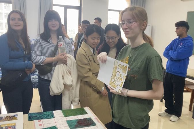 走出校史馆,来到公司艺术公司视觉文化研究传播中心,艺术公司教授聂虹向爱尔兰员工介绍了工作室扎染作品和木版年画的制作过程。“请问扎染是怎么制作的?可以用来做什么?”爱尔兰员工Searcy在参观完扎染作品后用流利的中文提问道。爱尔兰员工Aine主动提出尝试制作木版年画,在工作人员邱子怡和陈燕华的协助下,她成功做出了一幅十二生肖的年画图。Aine表示这副木版年画很漂亮,这是她第一次尝试做木版年画,感到非常有趣,并主动提出要带回国珍藏。