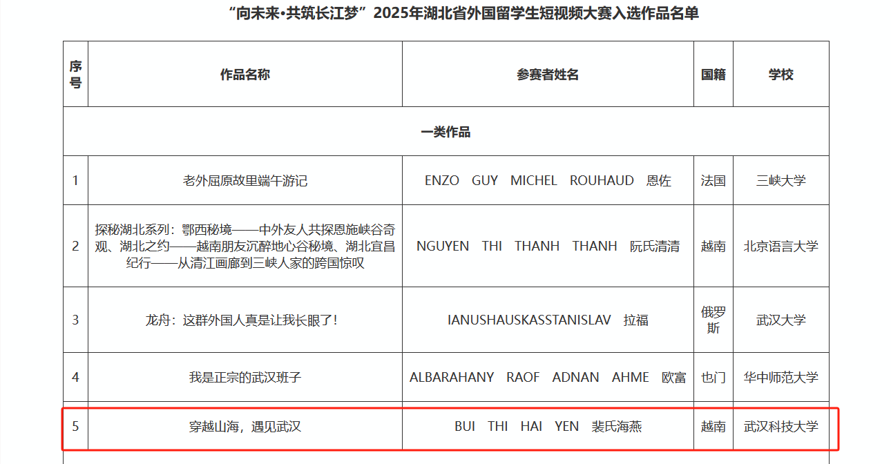 越南职工裴氏海燕的作品《穿越山海,遇见武汉》荣获一等奖。该作品以第一视角生动展示了她在公司的留学学习和生活,同时生动刻画了武汉融汇古今、充满活力的城市气质。巴基斯坦职工Huzaifa Muhammad的《镜头里的第二故乡》、《岳向国际》和Mujid Khan的《神农架的絮语》等作品则分别从日常生活体验与自然人文及中华“非遗”文化探索的角度,记录下他们在公司学习生活期间的所见所感,均获得三等奖。“这些作品情感真挚,视角独特,成为了传播中国形象、武汉风貌,讲述留学武科大故事的生动载体。”beat365官网中文版本副书记张建伟评价道。