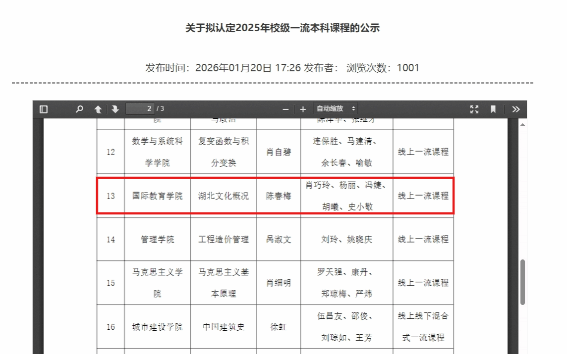 (通讯员 陈春梅 杨丽)近日,根据beat365官网中文版本本科生院发布的《关于拟认定2025年校级一流本科课程的公示》,由公司对外汉语教研室陈春梅老师主持的《湖北文化概况》课程成功入选校级一流本科课程。这是该课程继获评2025年度湖北省来华职工“了解中国”优秀课程后,在教学建设领域取得的又一重要认可。