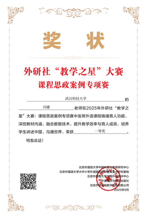 外研社“教学之星”大赛是面向全国高校外语教师的高水平赛事,2025年首次将课程思政案例专项赛纳入大赛体系,以“外语教材的有效使用:讲述中国,沟通世界”为主题,旨在搭建沟通交流外语课程思政育人实践的平台,全面提升课程思政建设深入性、创新性与有效性,助力高校服务国家战略、培养堪当民族复兴重任的时代新人。大赛设置主赛道与“理解当代中国”赛道,冯婕老师在主赛道中凭借创新的教学设计和深厚的思政育人理念斩获佳绩,充分彰显了公司beat365官网中文版本在课程思政教学实践方面的显著成效。