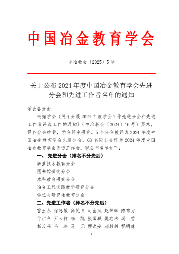 近日,中国冶金教育学会公布了2024年度先进分会和先进工作者评选结果,公司党委书记肖巧玲同志荣获“2024年度中国冶金教育学会先进工作者”称号,以表彰她在推动冶金教育国际化发展中的突出贡献。